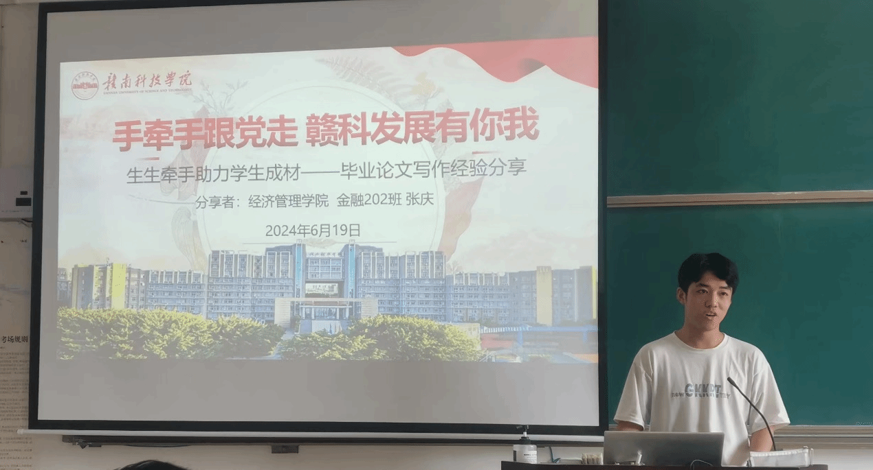 本网讯:6月19日上午,我院金融学专业在主教228教室开展主题为“手牵手跟党走,赣科发展有你我——生生牵手助力学生成材”的毕业论文写作经验分享活动。活动邀请金融专业优秀毕业论文候选人张庆同学为2021级金融学生分享毕业论文写作经验与心得,活动由金融教研室主任郑延智主持,胡佳老师参与。