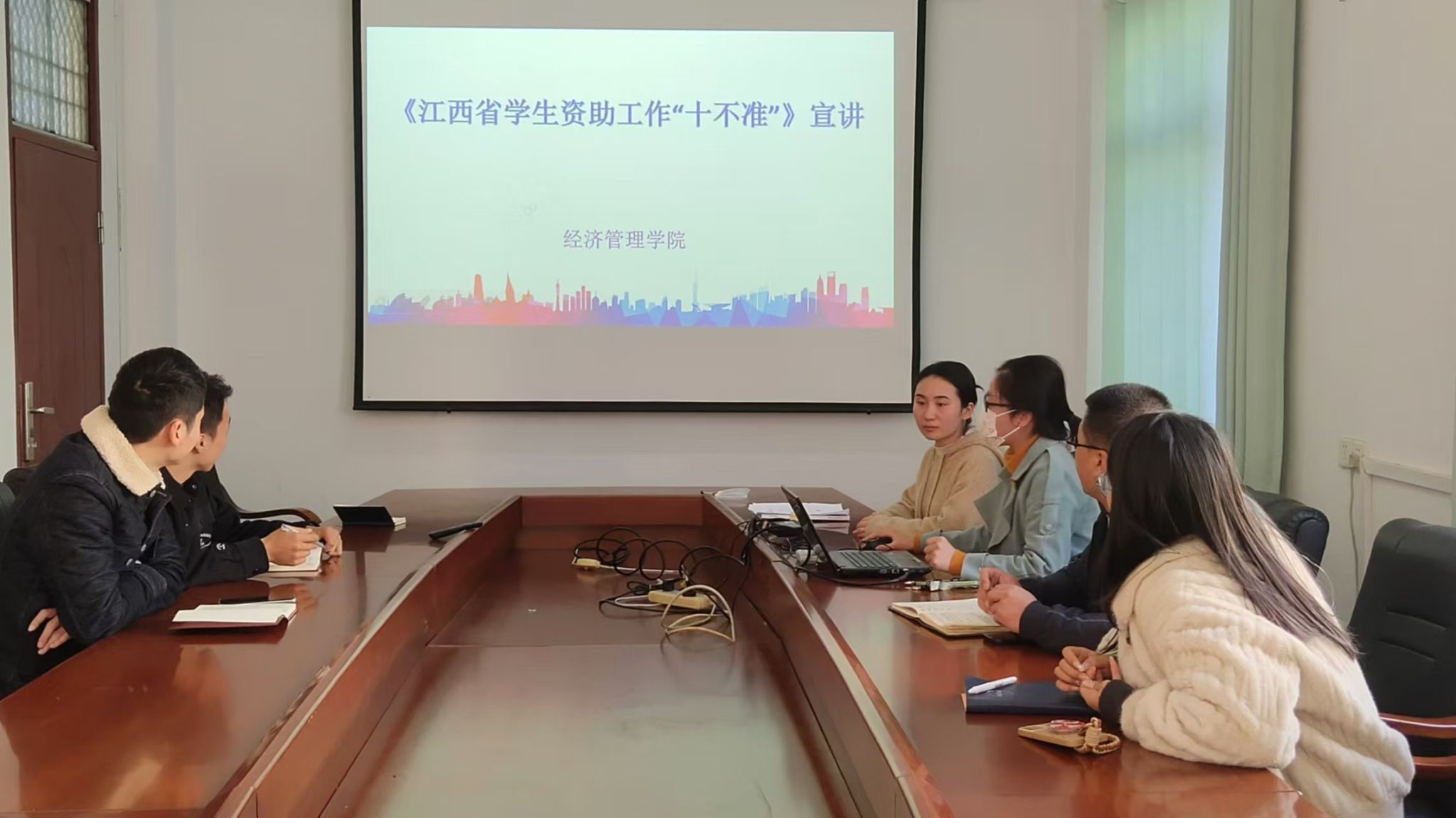 11月8日下午,新葡萄8883官网AMG官网在309会议室开展“十不准”学习宣传,学院辅导员参加了本次会议。会上,经管学院学生工作负责人梁文学重点就《 江西省学生资助工作"十不准"(修订版)》重要意义进行了强调,并对评审环节、公示和资金发放环节进行了详细地讲解,进一步明确了学生资助工作"十不准"的政策红线和实践指导意义,要求各位辅导员增强对制度内容的学习宣传,形成制度意识,保证资助工作宣传到位、落实在心,切实按制度办事。