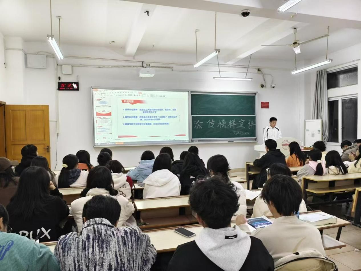 宣讲中涂传同学分别从学业、学科竞赛、科创、社会实践以及考研择校五方面向学弟学妹们传授了经验。首先以课程学习为主题宣讲的出发点,围绕"怎样学好课”这一问题,结合自身经历,指明了课程学习对未来规划的重大意义,强调了数学学习的重要性,推荐出了一系列有助于学习的软件平台并分享相关学习资源。然后涂传同学呼吁大家积极参与竞赛等社交活动,提高自身社会交往能力。最后从人生规划角度,涂传同学分享了自身经验,点明了考证、考英语四六级对个体发展的重大作用以及相关注意事项,并在此基础上结合社会现状,指出提高自身学历,练就过硬本领的必要性。