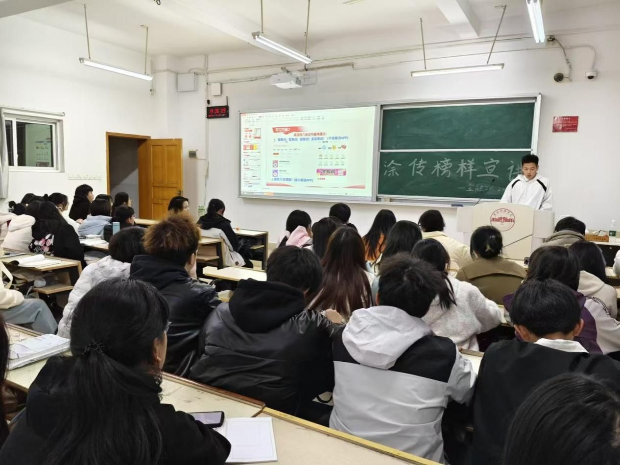 本网讯:为进一步激发同学们的学习热情,从优秀学生榜样中汲取力量,11月25日,新葡萄8883官网AMG官网举办“榜样赣科”主题宣讲活动。本次活动邀请获得2024年国家奖学金的涂传同学为大家分享自己的学习经历与感悟,2024级金融专业全体学生参加。